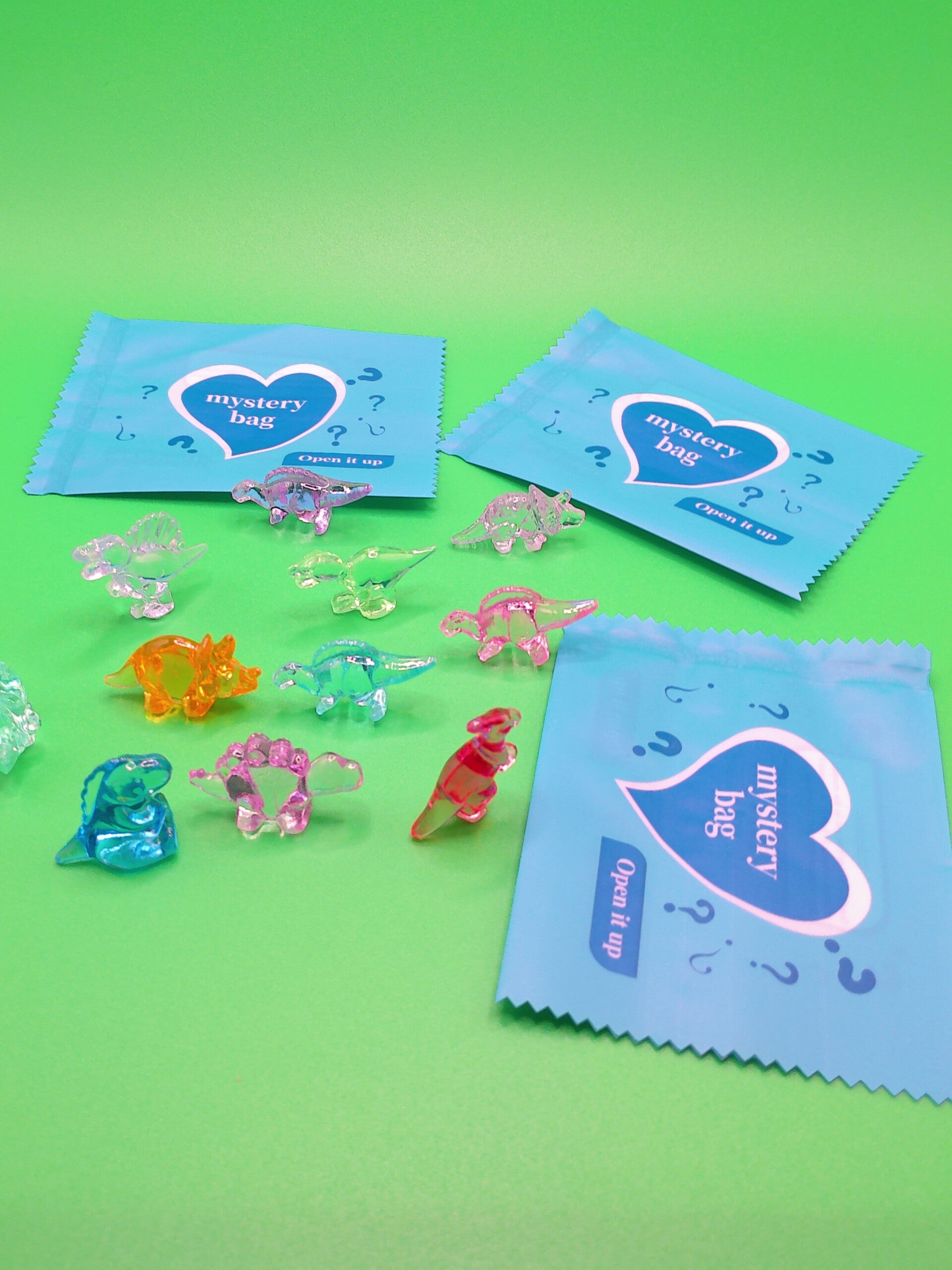 Miniatur-Dinos werden in einer Überraschungs Tüte mit 2 St. verschickt.